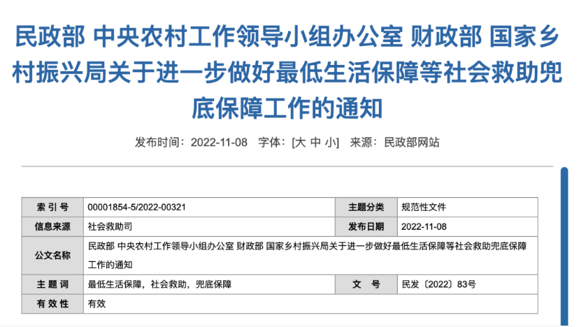 2022年11月8日,民政部等多部門聯(lián)合發(fā)布了《關(guān)于進(jìn)一步做好最低生活保障等社會(huì)救助兜底保障工作的通知》,通知中明確因疫情無收入的三類人,可領(lǐng)取救助金。