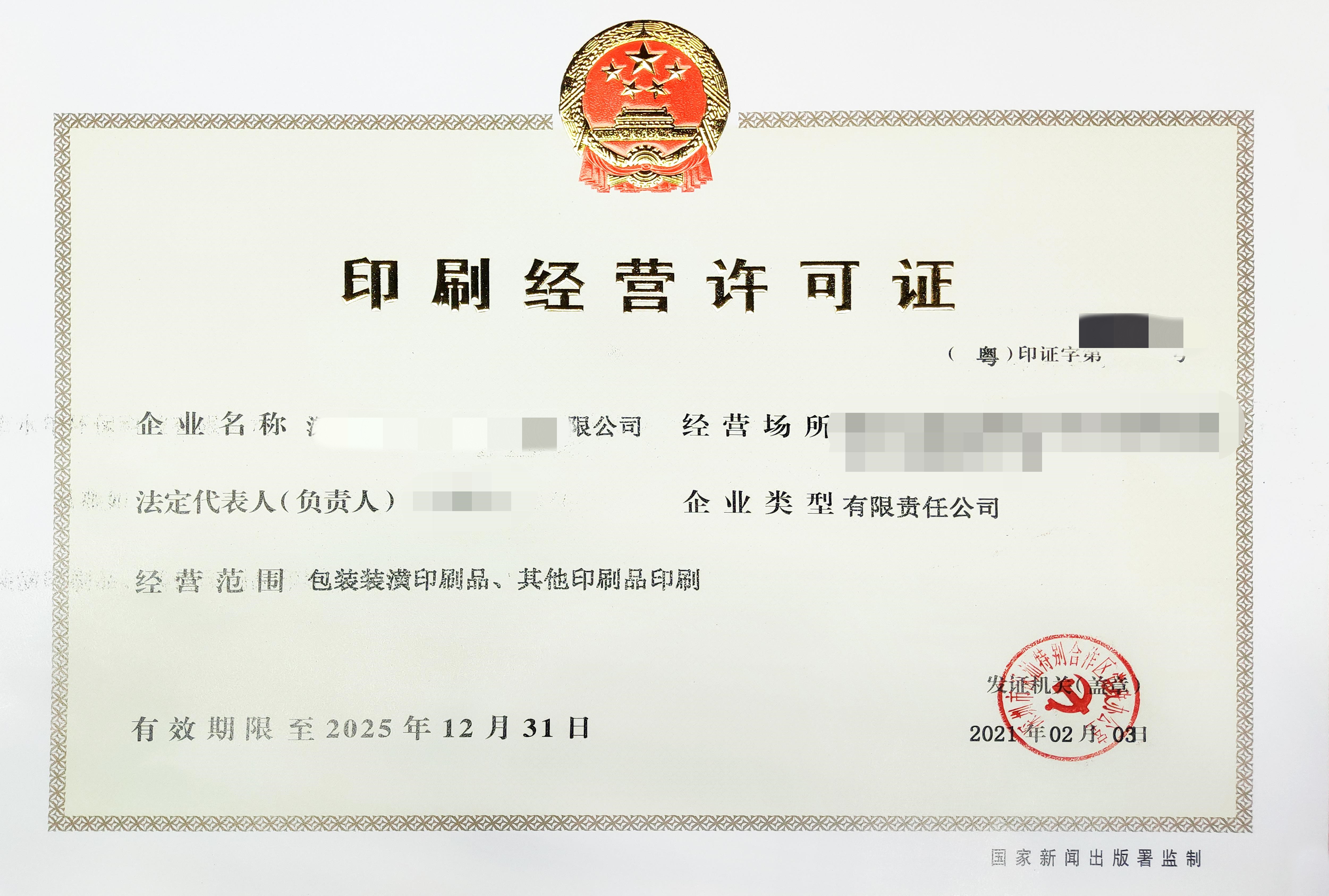 2、生產(chǎn)場地:包裝裝潢類不少于600平方米,其他印刷品類不少于100平方米;